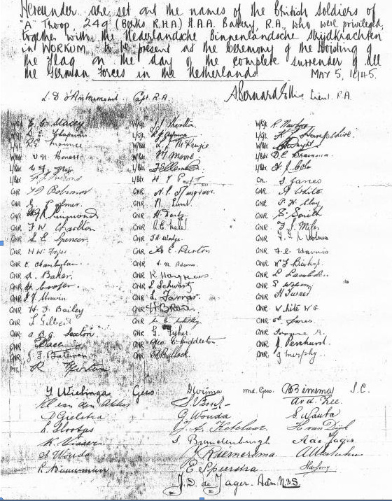 Hiernaast zijn geplaatst de namen van de Britse soldaten van “A” Troup 249 (Berks R.H.A.) H.A.A Batterij ,R.A., welke waren bevoorrecht, samen met de Nederlandsche Binnenlandse Strijdkrachten in WORKUM , aanwezig te zijn bij de de ceremonie van het hijsen van de vlag op de dag van de complete overgave van al de Duitse strijdkrachten in Nederland – Mei 5 ,1945.