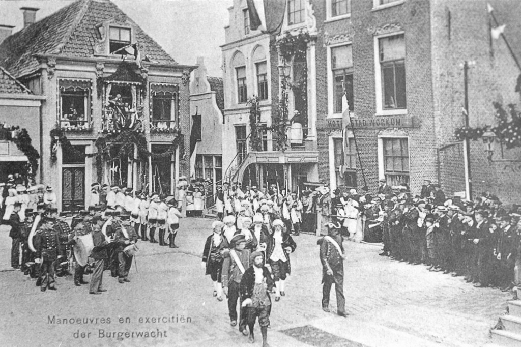 Alzo werd Workum genoemd in het versje dat elk schoolkind, fraai in kleur gedrukt, als aandenken ten geschenke kreeg. Het oude geveltje in de hoek van de Merk bestaat helaas niet meer; het was in 1907 de enige gevel van dit type met in- en uitgezwenkte top. Het onderste deel van het stadhuis was, zoals het opschrift bewijst, in 1907 nog hotel ‘Stad Workum’.
