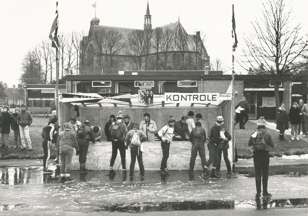 Uiterst links Timon Visser, met witte jas Eeuwe Riemersma met links van hem Tsjam Boogaard en uiterst rechts Ynte Huitema. De dertiende Elfstedentocht werd op 21 februari 1985 geschaatst. 22 jaar na de laatste Elfstedentocht in 1963 konden de schaatsen weer ondergebonden worden.