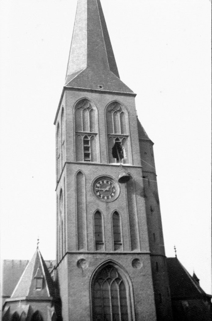 De Friso van 9 april 1949 stond het volgende te lezen: van de in bezettingstijd weggevoerde klokken hangen er alweer verschillende op hun oude plaats, zoals bijvoorbeeld ook in onze stadstoren. Vorige week verscheen hier een auto van de bekende klokkengieterij fa. v. Bergen uit Heiligerlee om voor de R.K. kerk een drietal klokken af te leveren, welke wat klank en gewicht vrijwel overeenstemmen met hun voorgangers. De grootste klok weegt 800 kg.