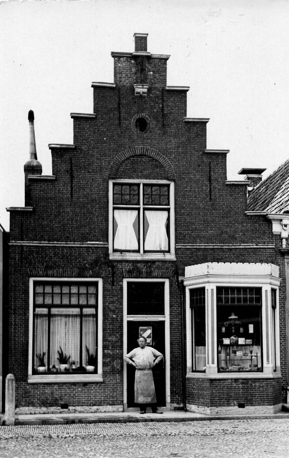 Op de foto staat J.P.Hoekstra voor zijn bakkerswinkel.