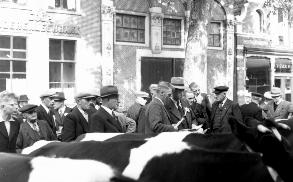 1946 – Op de gevel links Coöp. Boerenleenbank, daarnaast Sleeswijckhuys. Volgens de Friso van zaterdag 28 september hield de Krite- Commissie en Omstreken, haar districts- fokveedag, welke met ruim 300 inzendingen in 23 rubrieken, buitengewoon geslaagd is.