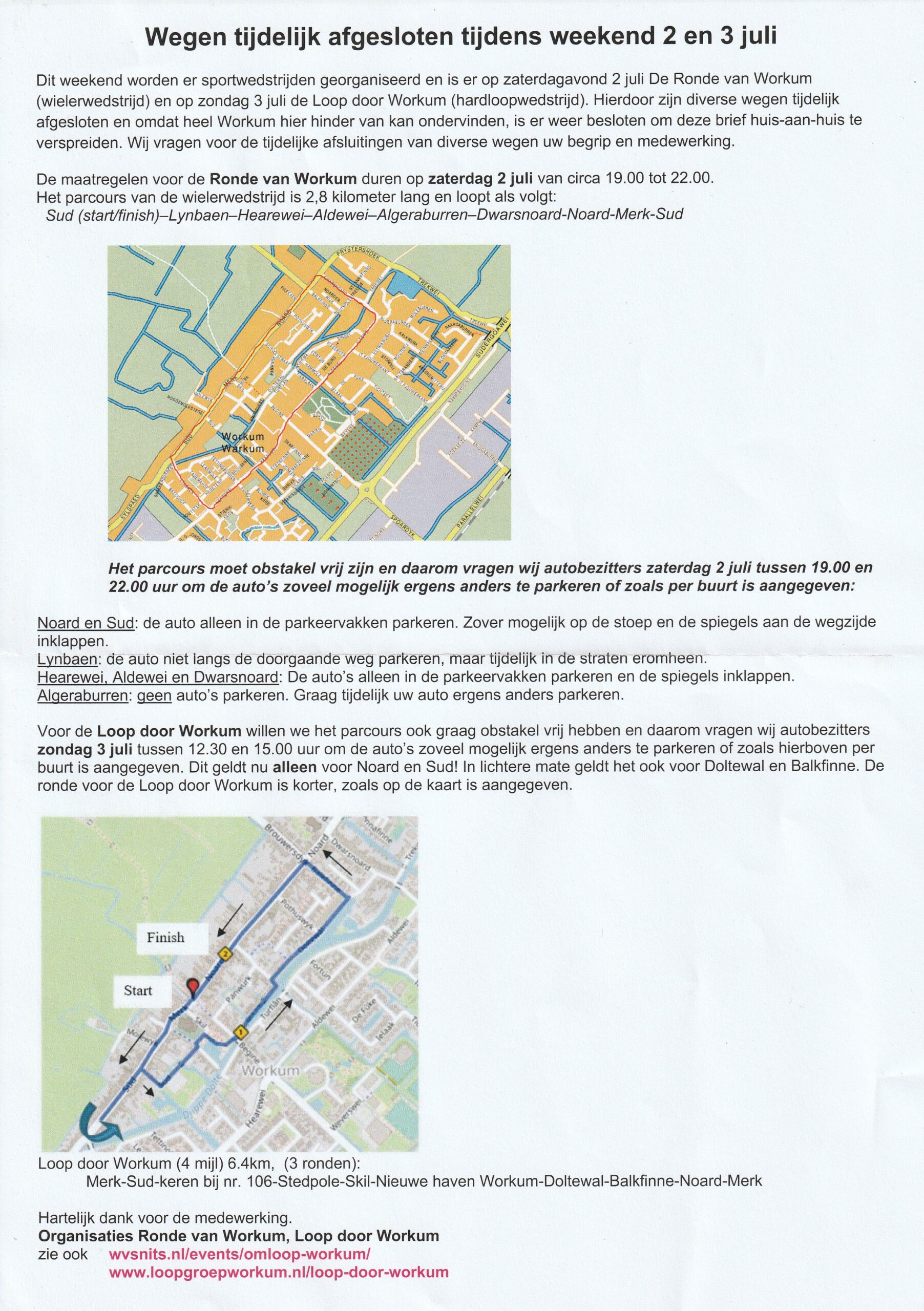 Dit weekend worden er sportwedstrijden georganiseerd in en rond het centrum van Workum. De Ronde van Workum (wielrennen) op zaterdagavond en de Loop van Workum (hardlopen) op zondagmiddag. Hiervoor gelden een aantal beperkende verkeersmaatregelen. Wegen zijn tijdelijk afgesloten en bewoners wordt gevraagd hun voertuigen elders te parkeren om de verkeersveiligheid te waarborgen.