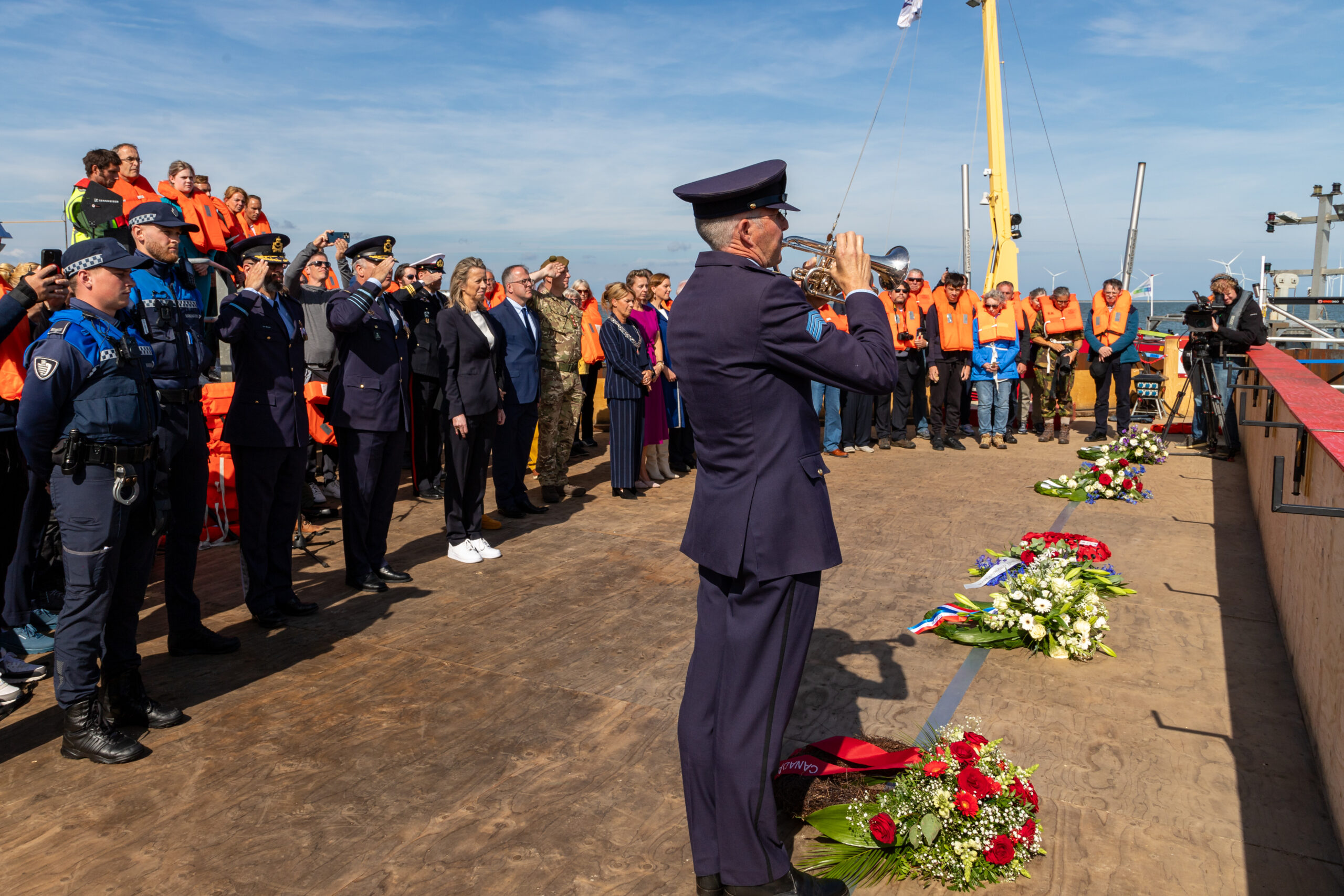 Minister Ollongren legde namens het ministerie van Defensie voor de Nederlandse regering een krans en Stieneke van de Graaf deed dat samen met Jurn de Vries namens het Nederlands parlement. Ook generaal Onno Eichelsheim, Commando der Strijdmachten en Erwin van Beljouw, commandant Air Support Command, betoogden hun respect door een krans te leggen. Namens de ambassadeurs van Engeland en Canada werden twee kransen gelegd. Burgemeester De Vries en wethouder Petra van den Akker legden vervolgens namens de gemeente Súdwest-Fryslân een krans. De zevende en laatste krans werd gelegd door de SMAMF.
