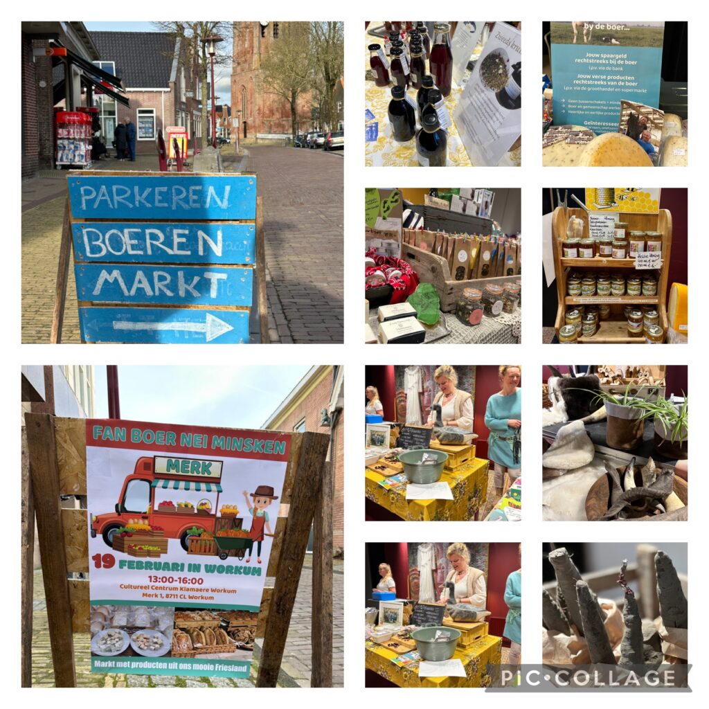 Wat je van ver haalt is lekker, luidt het gezegde. Maar niets is minder waar! Op zondag 19 februari was de eerste ‘Fan boer nei minsken’ markt in de Klameare. Tussen één en vier uur ’s middags was het een drukte van belang bij de kramen. De broden van Mevrouw de Molenaar waren rond half vier schoon op. Gelukkig was er volop lekkers en leuks om niet teleurgesteld naar huis te hoeven. Producten van ganzenvlees, likeuren, ediks, medicinale drankjes, eieren, schapenvachten, honing, thee, zeep, groenten, verschillende soorten kaas en nog veel meer stond aantrekkelijk uitgestald en mocht geproefd worden. Ondanks mijn vaste voornemen niets te kopen kwam ik met een tas vol naar buiten.