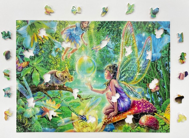 Lachend zei ze er bij: “Puzzelen op basis van kleur en vorm stimuleert de linker en rechter hersenhelft.” Dat ontlokte mij de reactie dat het dus voor ouder wordende mensen een goede oefening is om de hersenen bij de tijd te houden. “Je had het over de vorm van de puzzelstukjes. Ik ben een leek op dit terrein en zie eerlijk gezegd niet zoveel verschil.” “Je zou mijn stukjes eens moeten vergelijken met die uit een kartonnen doos. Mijn stukjes zijn van hout en de vormen zijn anders, ze hebben meer variatie.”