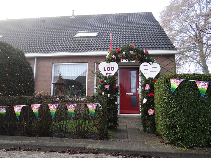Toen Maria (roepnaam Ria) Westendorp-Pas uit Workum 90 jaar werd stond er tot haar verassing een ereboog voor de deur. Toen was haar opmerking: die krijg ik toch op mijn honderdste verjaardag? Haar jongste dochter zei toen nog: “Nee mem, dan krijt mem der dan wer ien, oké?” Inmiddels zijn we 10 jaar verder en belofte maakt schuld, dus natuurlijk staat er opnieuw een ereboog Met heelveel lichtjes, zodat ook de buurt ervan kan meegenieten. Wat een mijlpaal, 100 jaar! De dag moest in huiselijke kring gevierd worden in verband met corona. De wethouder is op bezoek geweest, de thuiszorgmedewerkers hebben buiten staan zingen, ‘raamvisite met de bijbehorende buitentraktatie ‘gebakje-to-go’, kleinkinderen Oenema die een muzikale serenade brachten, ontzettend veelkaarten, bloemen en presentjes, interviews voor de kranten. Overweldigend allemaal. Hoewel we mem niet konden overladen met kussen en knuffels is mem ontzettend dankbaar dat ze dit allemaal mocht beleven. De dag is omgevlogen, en deze geweldige dag smaakt naar meer: mem is tenslotte ook ‘pas’ 100 jaar.