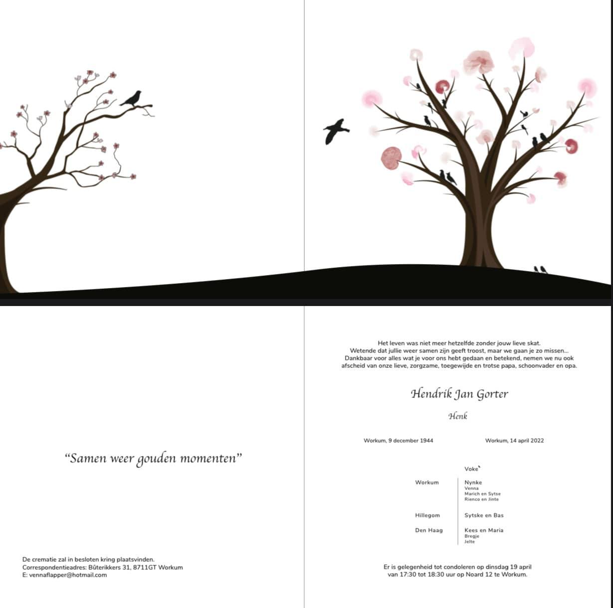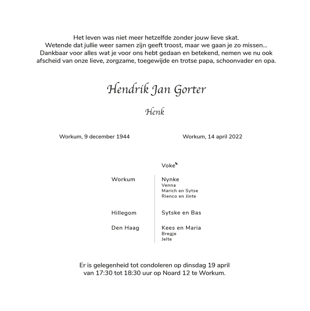 Op verzoek van de familie plaatsen wij het overlijdensbericht van Henk Gorter op onze website. Omdat het vanwege Pasen, niet tijdig in de Workumer krant Friso kan worden gepubliceerd, informeren wij jullie hierbij. Het afscheid van Henk is a.s. dinsdag van 17.30 – 18.30 uur op Noard 12. Crematie in besloten kring.