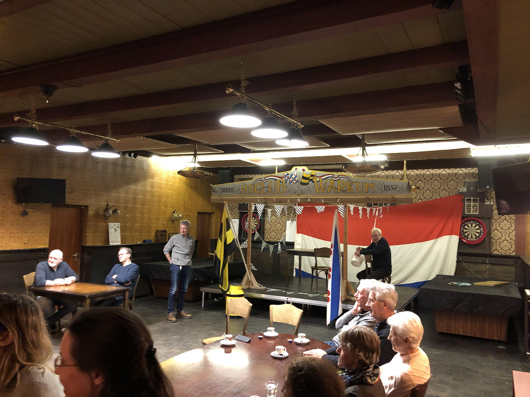 Nadien werd het nog een gezellig samenzijn onder het genot van een feestdrankje en op de vier televisieschermen werden beelden van vroegere Elfstedentochten getoond, waarbij vooral de passages in Workum hoge kijkcijfers scoorden. Aan alle tafels werd ondertussen over alle gepasseerde zaken nog een uurtje doorgesproken. Zo rond de klok van 22.00 uur stroomde het stemlokaal op het Noard langzaam leeg. Het eind van een gedenkwaardige vergadering. Wetende dat er in november een nieuw en erg gemotiveerd bestuur de teugels van onze vereniging gaat overnemen!
