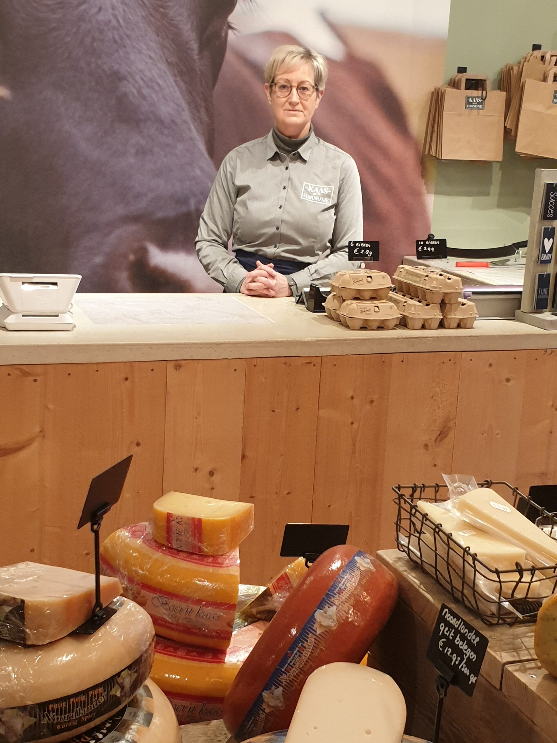 Laura Jellema, werkzaam in de zorg, wilde graag iets anders. Omdat haar partner Mike Lems, een passie had voor kaas en deze passie aan haar had weten over te dragen besloot Laura een kaaswinkel te beginnen. Laura: “Ik ben mij gaan oriënteren in de wereld van de kaas. Door corona was het volgen van een klassikale opleiding/stage niet mogelijk. Alles wat ik nu weet heb ik mijzelf, via internet, aangeleerd. Dat het Workum werd waar ik mijn winkel opende heeft zo moeten zijn. Ook al wonen wij nu ‘tijdelijk’ even niet in Workum, Workum heeft wel onze harten gestolen, wij voelen ons thuis in Workum, wij voelen ons hier ‘echt’ welkom. Wij maken zelf geen kaas, maar kopen de kazen bij Eisenga in Oosterwolde. Zij hebben een groot assortiment kazen en daarnaast zijn zij ook onze leermeesters. Wij verkopen voornamelijk gepasteuriseerde kaas, dit omdat rauwmelkse kaas, kaas waarbij de melk niet verhit wordt maar direct wordt verwekt, al wordt verkocht bij kaasboerderij de Nijlander. Zo kunnen wij elkaar op deze manier mooi aanvullen. Naast diverse (buitenlandse) kazen, kunt u bij ons ook terecht voor tapas, noten, vruchtensappen en wijnen. Kom gerust binnen en laat u verrassen door de kennis die wij, Mike en ik, in huis hebben. Wij staan graag voor u klaar.”