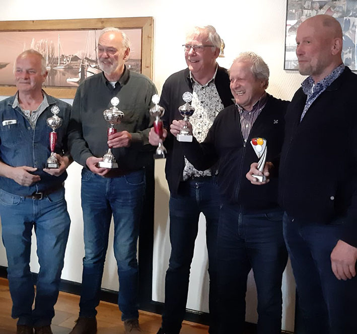 Uitslag Biljartvereniging Klameare. Van links naar rechts: Ale Ypma (2e prijs), Jan Veen (1e prijs), Vincent Stumpel (3e prijs), Johan Kruis (3e prijs) en Pier Spijksma (hoogste serie).