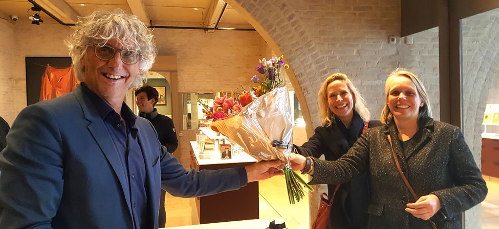 Op de foto: Directeur Peter Miedema krijgt een bos bloemen overhandigd van Jet van Mourik en lrma Zijlstra (geheel rechts) namens de Ondernemersvereniging Workum.