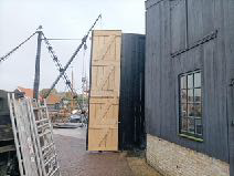 Nu waren deze deuren toe aan vervanging en is besloten om bij het samenstellen van de nieuwe deuren te onderzoeken of een combinatie van de originele samenstelling van de deuren gecombineerd kan worden met de mogelijkheid de deuren te openen met een enkele handeling. Hierdoor kan de oorspronkelijke uitstraling van de schuur met haar deuren weer bereikt worden.