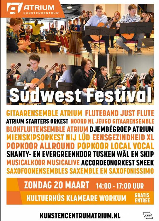 Vijftien muziekgezelschappen uit Súdwest-Fryslân treden zondag 20 maart op tijdens het Súdwest Festival in Workum. Verdeeld over drie zalen in Kultuerhús Klameare laten orkesten, ensembles en koren een gevarieerd repertoire horen met klassiek werk, jazzstukken en popnummers. Bij elkaar gaat het om ruim 220 muzikanten van alle leeftijden.